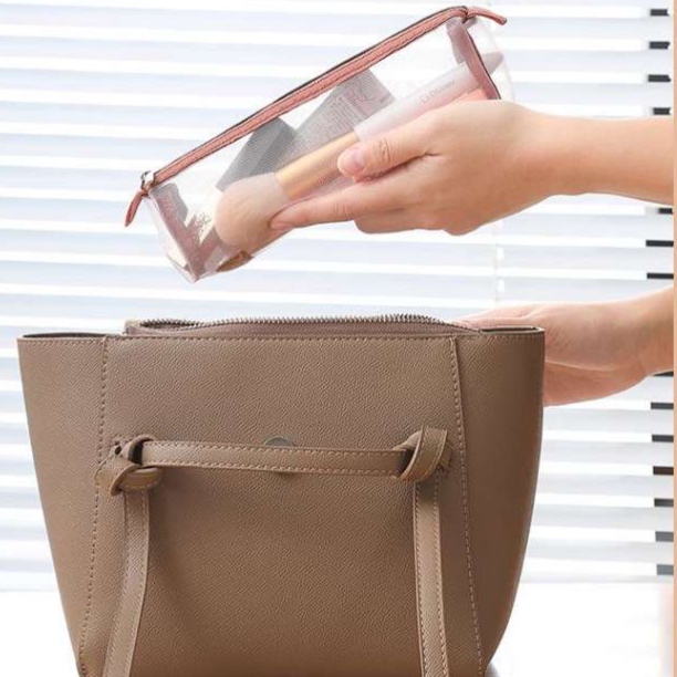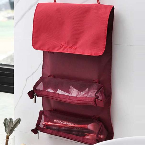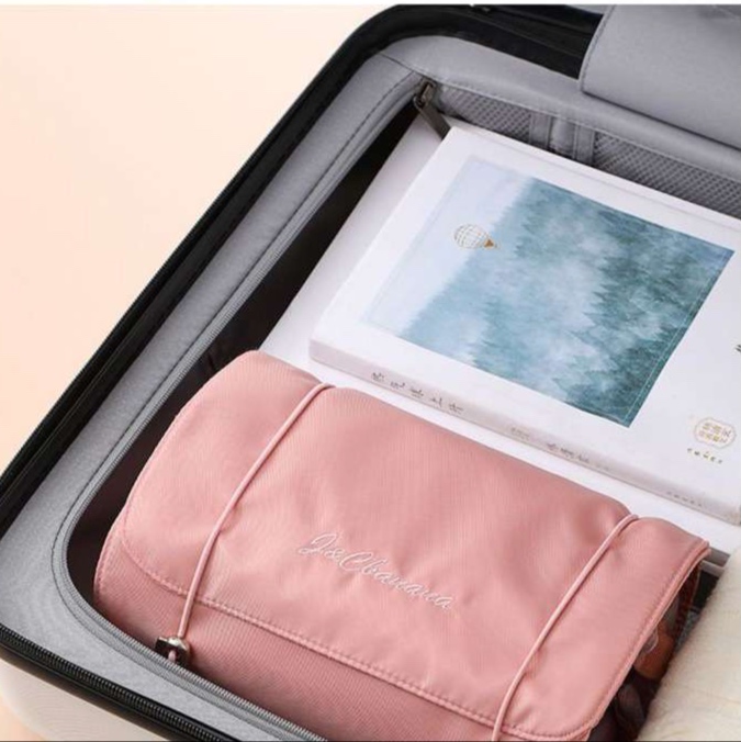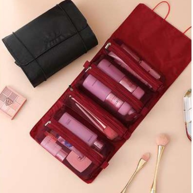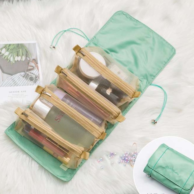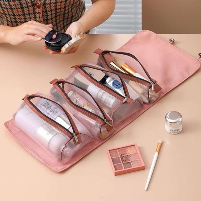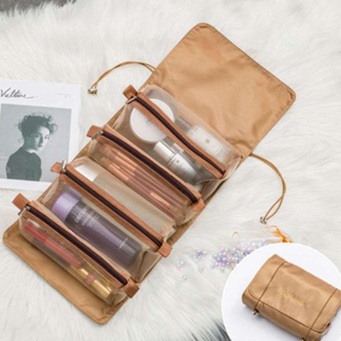 家族旅行に最適な多機能収納ポーチ。透明な仕切りポケットで中身が一目で分かり、コスメや小物をキレイに整理できます。